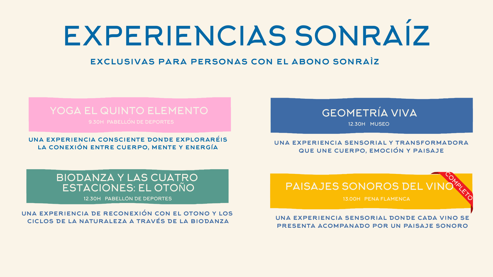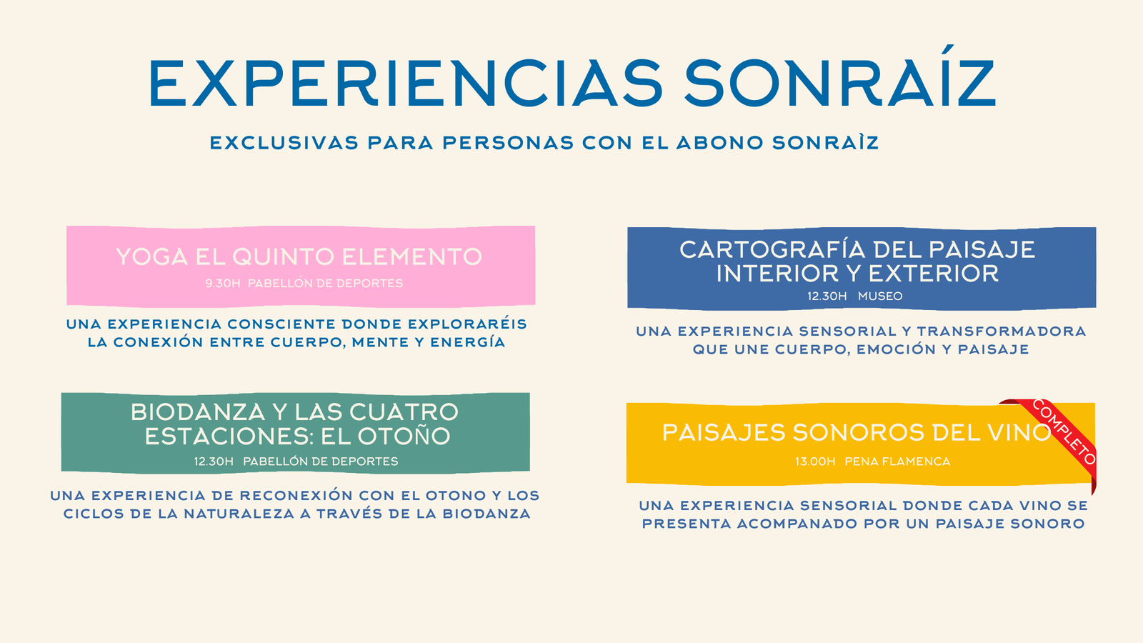 Aquellas personas que hayan adquirido su Abono Sonraíz experiencia completa podrán disfrutar de una de las cuatro experiencias