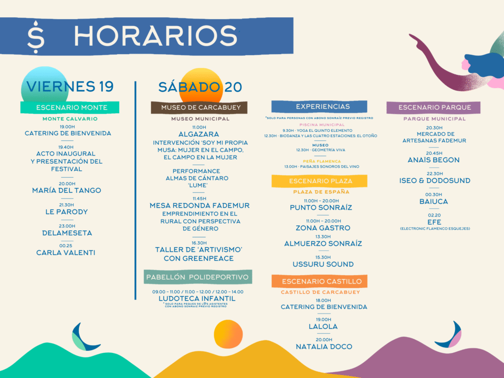 El Museo de Historia de Carcabuey acogerá una intervención artística protagonizada por las creadoras Maranda Varo, Almudena Castillejo y Clara Gómez Campos. Durante esta acción en vivo, el público podrá ser testigo del proceso de creación del mural METAMORFOSIS, una obra que reflexiona sobre el cambio y la transformación cíclica desde una perspectiva femenina. También crearán una intervención artística que permanecerá en exposición todo el fin de semana en el Museo de Carcabuey. En este contexto, las artistas estrenarán el documental 'Soy Mi Propia Musa', sobre una intervención artística que llevaron a cabo veinte artistas cordobesas hace un año y que estuvo también expuesta durante la tercera edición de Sonraíz.